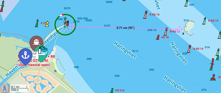 Een voorbeeld: het is nieuwe maan en dus erg donker. U heeft een route uitgezet en bent van plan om voor Hellevoetsluis van koers te veranderen. Ton HV5 heeft geen licht en u bent bang dat u deze niet goed kan zien.