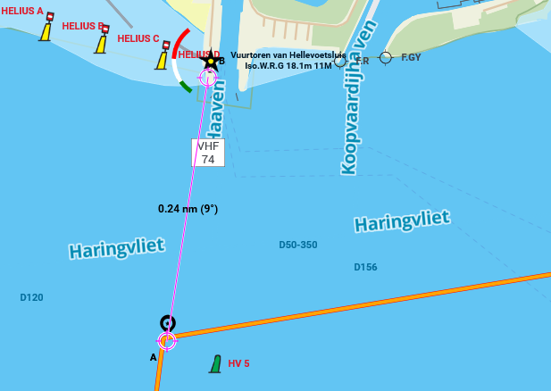 Met de passerlijn ziet u dat u vanuit het waypoint de vuurtoren van Hellevoetsluis peilt in een richting van 009°. Oftewel, u kunt de toren in de gaten houden over het kompas en zodra u deze op 9 graden of meer peilt weet u dat u de koers kunt verleggen.